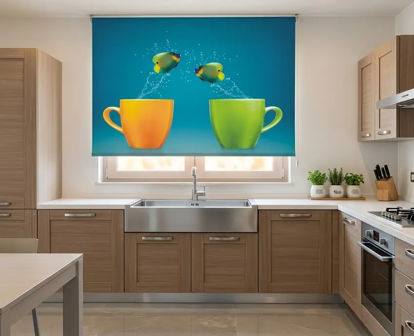La Cortina Enrollable Cocina Tazas combina perfectamente con muebles de madera clara, encimeras blancas o decoraciones vintage. Su diseño aporta un toque divertido y hogareño, ideal para quienes disfrutan de una cocina viva y personalizada. Puedes complementarla con accesorios de colores cálidos o utensilios metálicos para lograr un equilibrio visual.