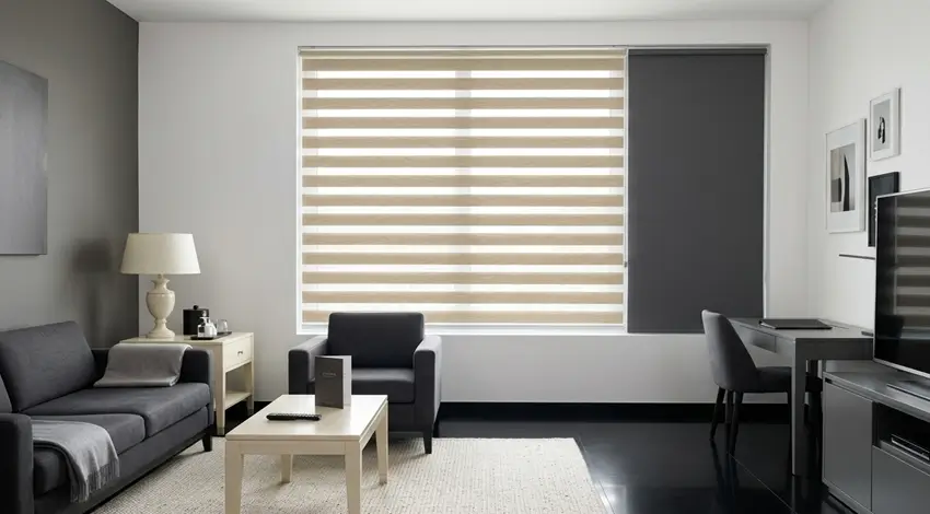 La roller duo zebra tiene franjas alternadas que permiten controlar la luz sin subir totalmente la cortina, ofreciendo privacidad parcial o total según la posición.