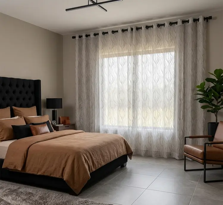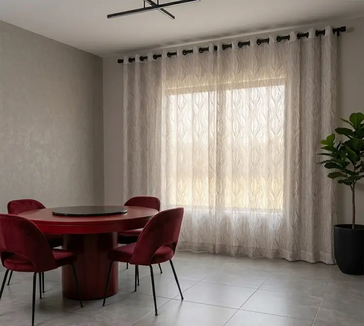 El Tul London se distingue por su tejido translúcido de alta calidad y su acabado labrado descendente, que aporta profundidad visual sin recargar el ambiente.